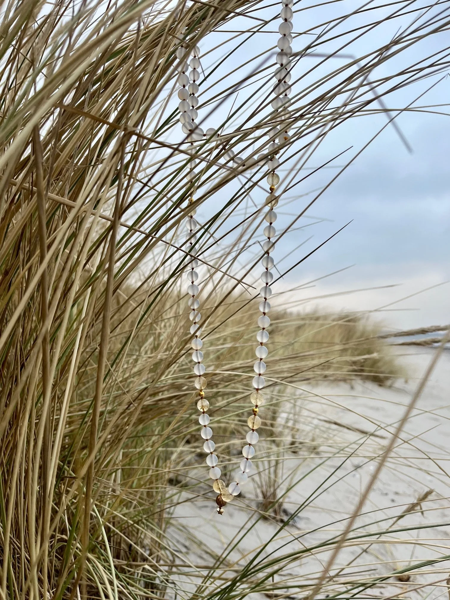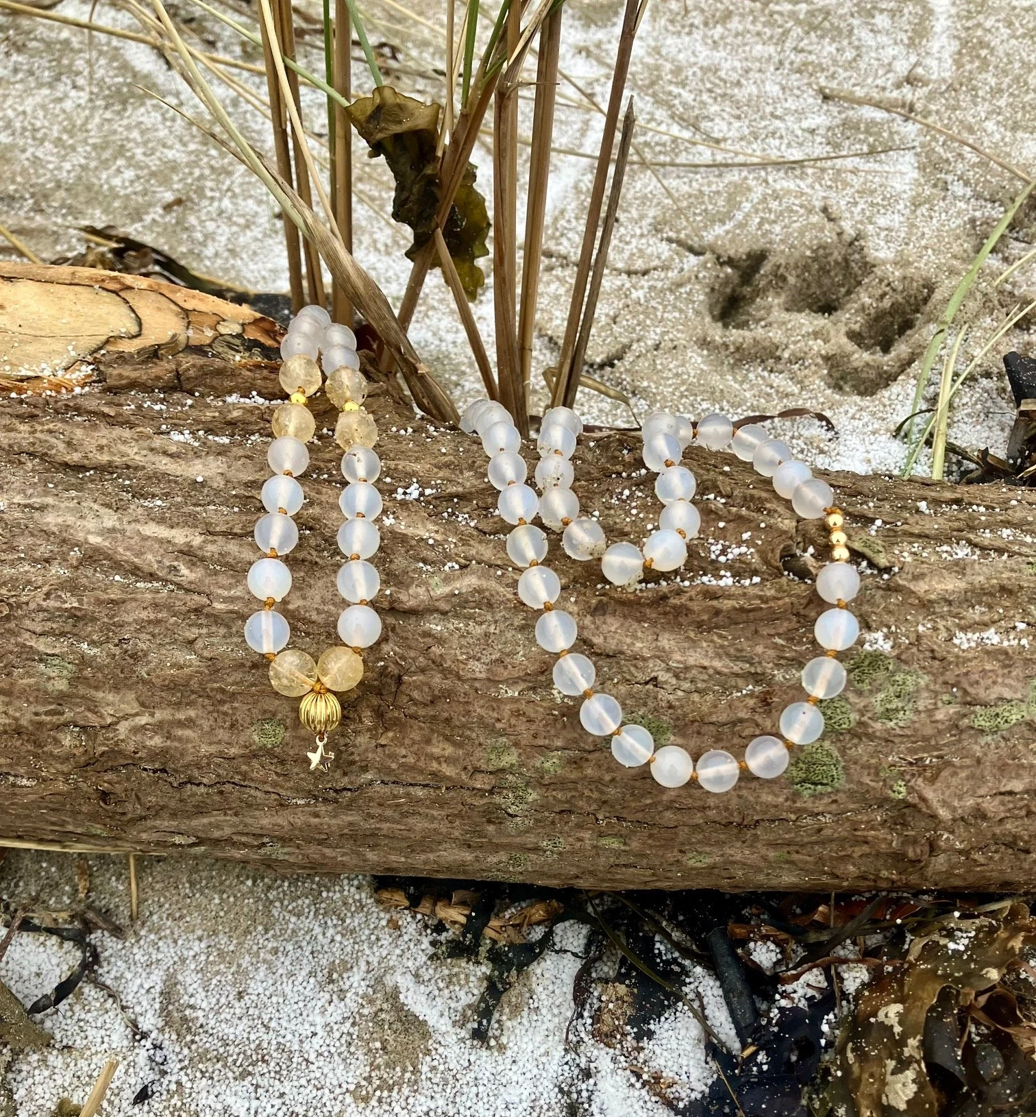 Denne mala består af krystallerne hvid agat og citrin. Malaen er del af en nordisk kollektion og kommer med klarhed, styrke og positivitet. Malaen støtter dig i at se klart, stå rent i dig selv og gå efter det, du mærker. Malaen kommer med indre fred og støtter dig i at finde balance mellem gøren og væren.